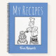 A notebook for recording favourite recipes and cookery tip and tricks. Add the name of the owner and compiler to make this a truly personal item that will be long treasured. Illustration of a woman with chef's hat, up a stepladder, icing a cake, and colour theme of blue and white. Gift for a cook, or a nice present for a bake-off fan.