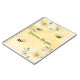 Yellow, white background with a honeycomb pattern. Decorated with light yellow, cream colored tropical florals flowers, hibiscus and happy bumble bees. The text: Summer Recipes in green hand lettered style script. Perfect as notebook for your summer recipes.