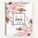 A chic white background with pink florals, roses, sprigs and brown, golden feathers. Summer boho, bohemian style. A grey and white frame with space for your name and monogram letter. The name is written in black with a modern hand lettered style script. Monogram letter in grey. Perfect for your favourite food, cuisine recipes.