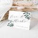 Chic automne botanique merci notes vous laissez express votre gratitude à vos invités mariages dans un style élégant. Le devant présente "l'amour et les remerciements" en calligraphie non-noire en lettrage accentué avec l'aquarelle feuillage dans les tons de chasseur, forêt et vert sauge. Personnalisez avec vos noms le long du bas, et customisez l'intérieur avec un message préimprimé et une signature personnalisés ainsi qu'une photo mariage préférée. Conçu pour se coordonner avec notre collection de mariages et de papeterie événementielle Harvest Sage.