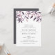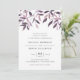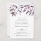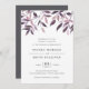 L'invitation de mariage rustique et élégante présente un riche lettrage off-black en bloc chic et en italique, surmonté d'une bordure de feuillage de chute d'aquarelle dans les tons de moisson automne violet et bleu minuit. Les dossiers d'invitation sont bleu marine solide.