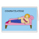 A cartoon woman lying on a chaise longue wearing jeans and pink shoes and two pink bows covering her upper half. The image has a pastel blue background and says 'Congratulations'.