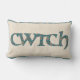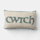 Un coussin lombaire amusant avec le mot gallois 'cwtch', qui signifie 'caquette' ou 'câlin' dans un script celtique, rempli d'un motif cachemire élégant.