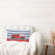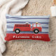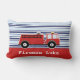 Le coussin personnalisé de ce garçon comporte une mignonne machine à incendie sur un arrière - plan rouge avec et bleu et blanc rayé moitié supérieure. L'image est entourée d'une ligne de contour blanc pour l'aider à la distinguer de l'arrière - plan. Il est prêt à être personnalisé et convient pour le transport d'un garçon de chambre à thème camion feu ou pour un garçon qui aime les moteurs incendie.