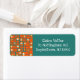 These return address labels have a mid-century modern design of orange rectangles with white and gold circles in them and teal horizontal lines crossing them on a field of teal.