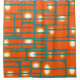 This shower curtain has a mid-century modern design of orange rectangles with white and gold circles in them and teal horizontal lines crossing them on a field of teal.