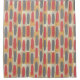 This shower curtain has a geometric design of rectangles in tan, grey, and off-white making the background with ovals in brick red overlaying them.
