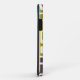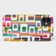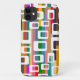 This phone case has a mid-century modern design of rectangles with holes on a field of stripes.