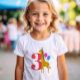 A happy giraffe is ready to party with colourful balloons and a party hat making this shirt an adorable choice to celebrate the birthday kid with their age in a large red editable number for their specific age.