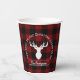 The product design features a silhouetted profile of a reindeer on a classic red and black buffalo plaid pattern. Combined with your own personalized text, this composition makes farmhouse country-style, modern, and unique paper cups for Thanksgiving, Christmas holiday, family reunion, or any other special gatherings!