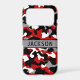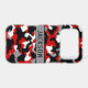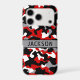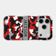 Customize this red, black, gray and white camouflage iPhone 17 pro case with your name in a trendy modern CAP font in black on gray. It's masculine and perfect for your favorite military, hunting, country or outdoorsman!