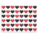 A repeating pattern of red and black hearts arranged in alternating rows on a white background.