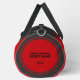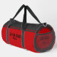 Sleek and modern gym duffel bag design with customizable sports typography in bold black against a vibrant red background. Accented with dark gray and red stripes for a stylish touch.