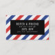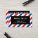 A patterned business card for a barber featuring red and blue stripes on a white background. On one side, the design covers the whole area of the card with a space for a discount or referral offer in the center and on the other side, there's a narrow stripe down one edge leaving plenty of room for your name and details in white text on a black background.