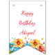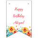 Personalized birthday banner in red and blue with pretty watercolor illustration of a birthday cake with flowers, age and name.
