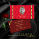 YOUR FAVORITE - Make a lasting impression with this elegant and luxury business card design featuring shimmery golden decor borders and oval frame with your (employees-) photo. On the front matching monogram pattern on a red background and the back is burgundy - wine red.