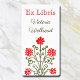A custom bookplate label with etched and script letters and vintage art of daisies and curling leaves in red and golds, restored from an antique manuscript.