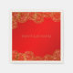 This elegant design, called Red and Gold Flower Indian Wedding, has a red background. On the front there is a gold glitter stylized flower border at the top with one flower in the lower right corner. In the centre there is another flower to highlight the couple's name in gold below. The back has a red background with your text in gold. This set has invitations, save the date cards, response cards, thank you cards, table number cards, wine labels, wedding programs, and many more day-of wedding stationery pieces, favours, and gifts to coordinate. All elements are printed on our high quality products, they do not include any real gold, jewels, embossing, or other textile elements. All designs are copyright Noteable Expressions, Inc. All rights reserved.