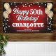 Fun banner sign for indoors or out, featuring festive silver metallic balloons on both sides of the design with sparkly, golden metallic confetti on a rich textured rich red background for your personalized birthday banner. This product doubles as a wonderful milestone birthday keepsake.