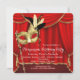 Masquerade birthday party invitation with beautiful gold Mardi Gras feather mask on a red and gold curtain background. This elegant red and gold birthday party invitation is easily customized for your party or event by adding your event details, font style, font size & colour, and wording.