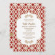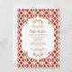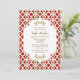 Elegant and beautiful french Moroccan inspired bridal shower invitations with a repeating scarlet red ruby and gold geometric pattern design and gold hued floral flourishes. This upscale and luxe invite is perfect for any formal, exotic, Moroccan, Arabian Nights or Aladdin themed bridal shower. The back of these custom, fancy frame invitations and announcements can be personalized with the soon to be bride's monogram and event name on the quatrefoil shape and printed ribbon look design. Artwork and design © Chrissy H. Studios, LLC. All Rights Reserved.