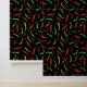 Hot chilli pepper patterned wallpaper printed with bright red and green cayenne chilli peppers on black