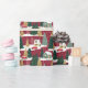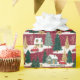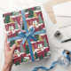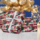 A charming Christmas village patterned wrapping paper featuring cozy cabins, vintage red cars, snowy pine trees, and falling snow against a festive red backdrop. This nostalgic winter scene brings warmth and cheer for your holiday season gift wrapping. Merry Christmas text can be amended as needed, personalize with a name or a different greeting.