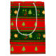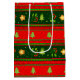 Present your gifts in style! Perfect for festive presents, this Medium Gift Bag, featuring red and green large horizontal stripes, embellished with green Christmas trees, red flowers with green leaves and cute golden stars, will add a burst of colour to your gift giving. This is a great way to present any special surprise this Christmas!