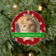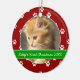 This ornament is perfect for your kitten's first Christmas with a spot to put your cat's name and the year on a red paw print background and contrasting green band.