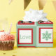 Add four medium-large personalized custom digital photos to this festive classy square jumbled frame shape picture frame wrapping paper that says "love and joy" with light and dark shades of grey, red and green.