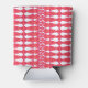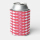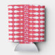 This can cooler has an art deco design of diamonds and triangles that look like bowties in red and pink.