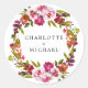 The engaged couple's names are surrounded by a beautiful pink and red floral wreath. The watercolor design includes blush pink roses, bright red poppies and lots of pretty greenery and vines. Easy to customize.