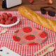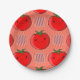 Tomato drawing. Custom paper plates. Pink and red plaid pattern background.