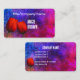 Red tulips on vivid colourful paint splatter watercolor abstract art background makes bold statement for business card design which is double sided to personalize for any profession or occupation. Original photograph and artwork copyright Ann Powell all rights reserved.