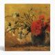 Vase With Red And White Carnations on Yellow Background by Vincent van Gogh. This vintage fine art post impressionism still life floral painting features a bouquet of blooming carnation flowers from the garden in a vase.