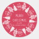 White wreath made up of Christmas trees and gingerbread houses surround Merry Christmas which is written in a very modern handwritten font. Your name follows below. The berry red background with white text creates an eye-catching design. One of the Christmas trees is solid white. The second has flowing white branches. The gingerbread house is a detailed outline that shows a lot of the red background. The result is a modern and open design.