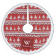 Red and white alpine fir trees, Nordic sweater inspired, design Christmas tree skirt with a cranberry red decorative square containing your personalized white monogram letter and full family name.