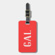 Red luggage tag features your monogram initials on one side, and your name and address on the other. The font is glamourous and elegant in crisp lovely white.