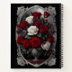 Dark red and silver grey-white roses in an ornate vase inside a dark silver grey ornate frame on a black background for your Goth notebook.