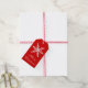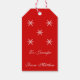 Stylish and festive white snowflake on a red background colour and a customizable text area that now reads "Merry Christmas!". On the other side you can write the names of the gift receiver and sender.