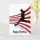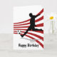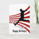Modern soccer design featuring a silhouette of a soccer player kicking a soccer ball on a background of red and white arching lines. The perfect birthday card for the soccer player whose team wears red and white or a fan of a red and white team. The text, Happy Birthday, is fully customizable for your own message on the front. The inside of the card is blank for your own birthday message. pgb1501