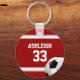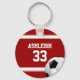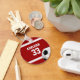 Perfect for the soccer fan or soccer player whose team colors are red and white, with a soccer jersey style design in red with white stripes and customizable text for their name and number. A soccer ball is also featured as part of the design. A fun and sport personalized soccer gift.