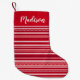 Add a festive touch to your holiday mantle this Christmas with cute, personalized Christmas stockings. The Christmas stockings feature your name at the top in a white script font with a red background. The design features a red, burgundy, and white sweater knit pattern. The simple, elegant Christmas stocking is sure to impress your holiday guests.