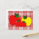 Four red and yellow apples on red plaid postcard
