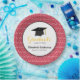 This graduation paper (disposable) plate features a graphic of a graduation hat (mortarboard) and customizable text for: Class of, Graduates Name, Name of School. This paper plate is accented with a white swirl pattern on a red background. The word "graduate" is yellow.
