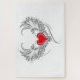 Artistically painted red heart with angel wings grey, decorated with black smooth contour.
