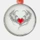 Artistically painted red heart with angel wings grey, decorated with black smooth contour.