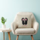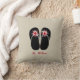 A pillow for teachers featuring an illustration of a pair of black flip flops decorated with red apples. Personalize with your name in red. Opposite side is red.