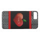 Le coque de l'enseignant iPhone 7 fait en noir, avec des pois noirs et blancs, en haut et en bas et bordé d'une bande rouge. Des graphiques mignons d'une grande pomme en forme de coeur rouge, décorent le milieu du coque. Texte en blanc, lit iTeach. Personnalisez le texte pour lire ce que vous voulez.
