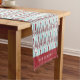 Set a modern yet festive table this holiday season with this colourful ikat patterned table runner in vibrant red, icy aqua, and crisp white. Personalize with your family name or monogram at each end in classic white lettering on a band of red.